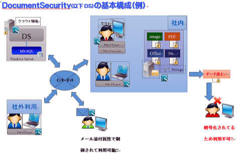 @暗号化機能:DocumentSecurityはファイル単位で高度な暗号化を行っているので、クライアントのハードディスク、USBメモリ内、メールを誤送信してしまった場合でも暗号化は維持されたままです。ハードディスクの暗号化、フォルダ単位の暗号化と違い、ファイルの保管場所が限定されません。
